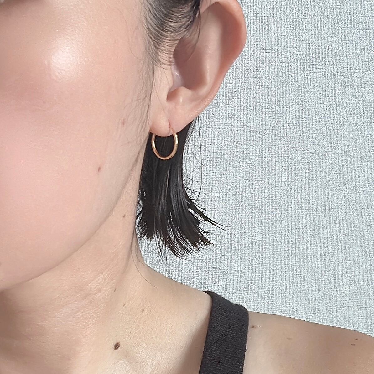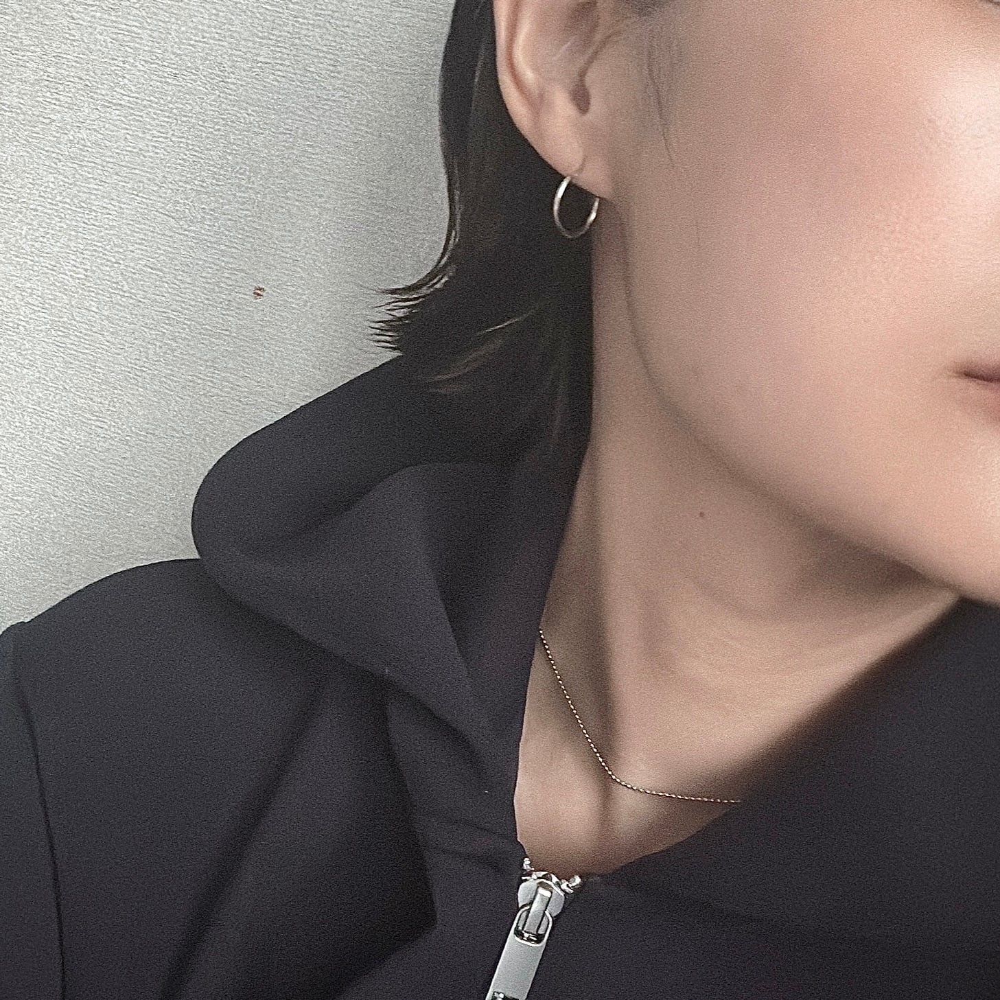 細く繊細なフープピアス。上品で控えめだからこそ、より目線を惹きつけます。