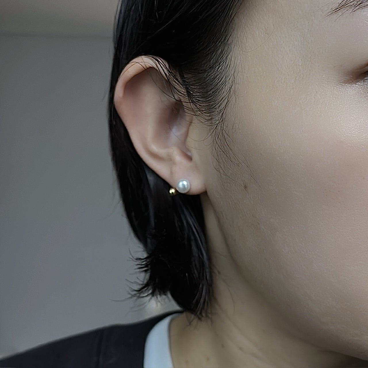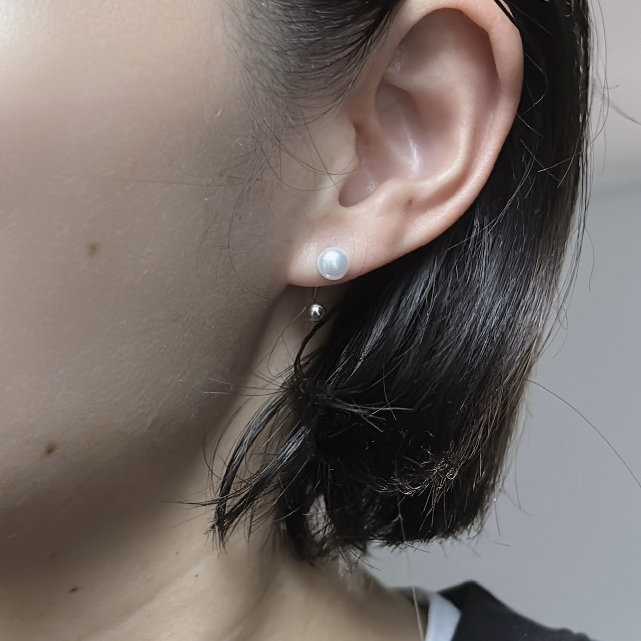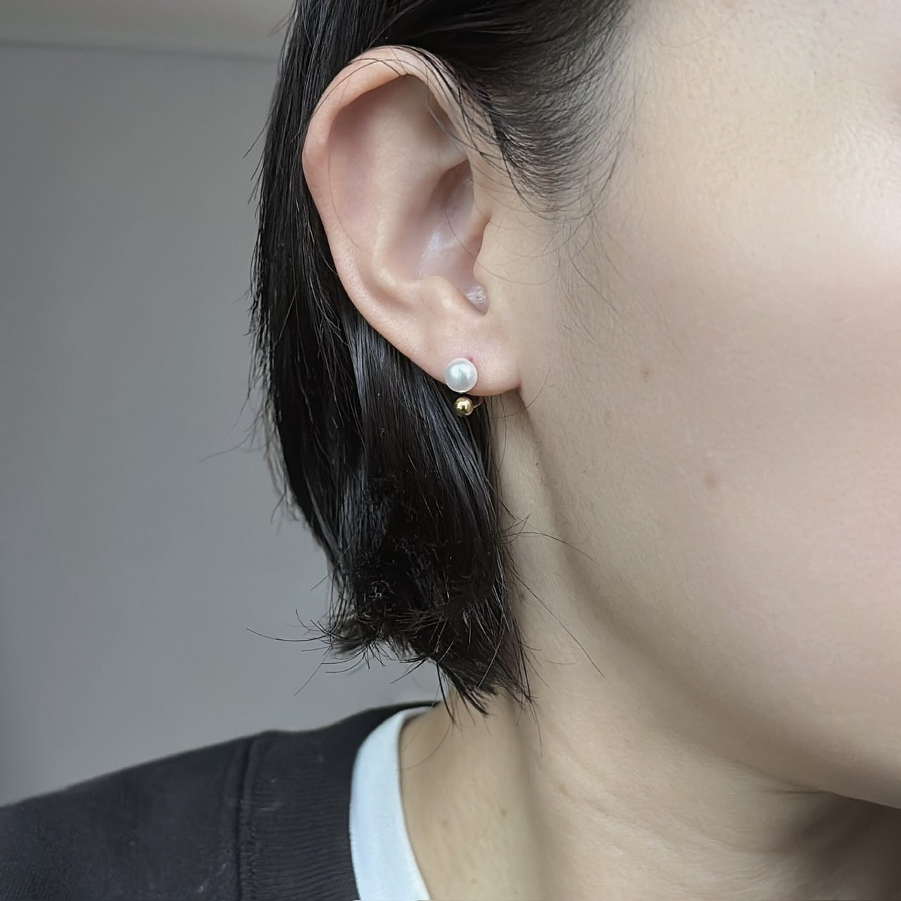 耳の表から通すとパールが上に、後ろから通すとパールが下にあるデザインが楽しめるので、ご自身の耳の形や好みのスタイルに合わせて付け替えていただけます。