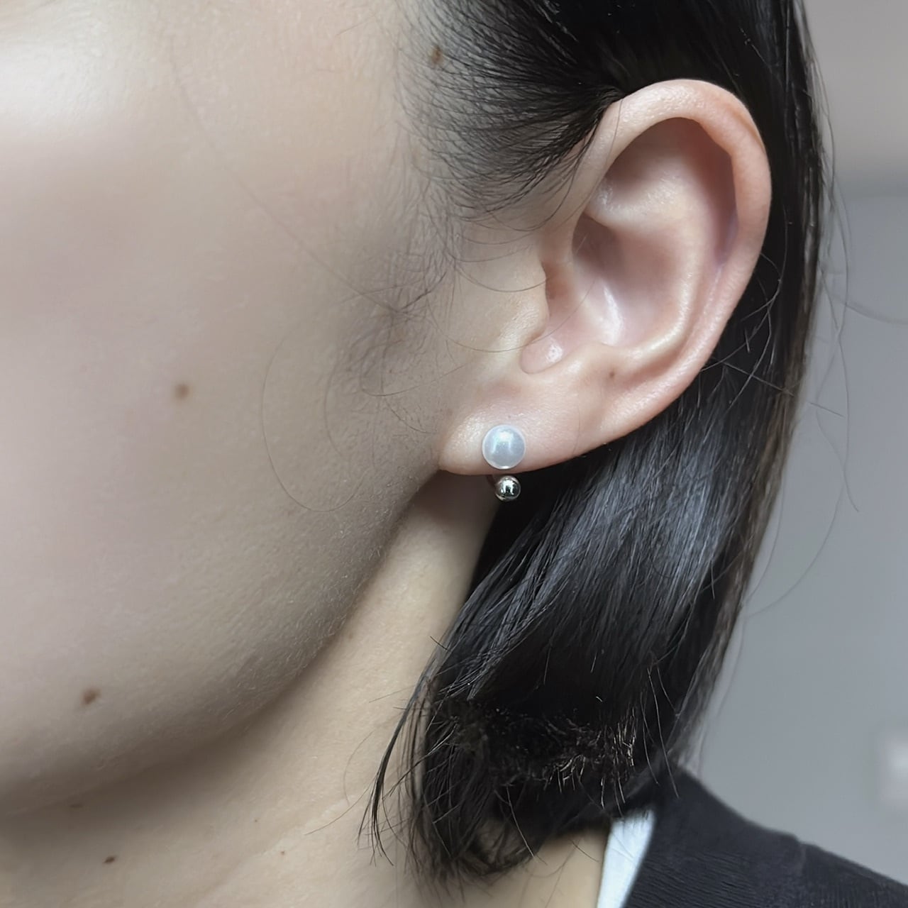 ※着用モデルのサイズ:耳たぶの厚さ5mm、ピアスホールから耳下までの距離5mm。着用後、パールとボールの距離をつけるようにぎゅっと押さえて変形させて使用しています。